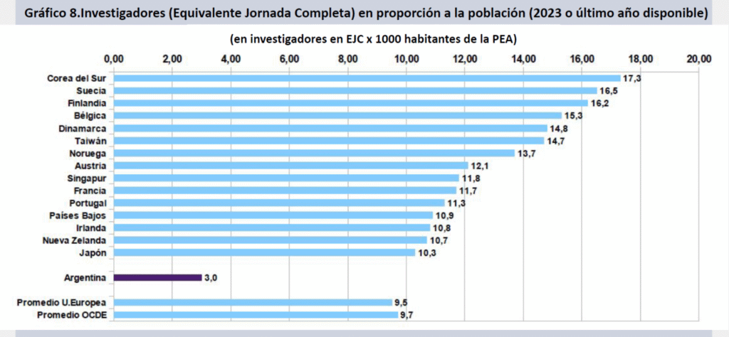 El Grupo EPC-CIICTI aseguró que “este profundo ajuste sobre el sector se realiza en la creencia de que se encuentra ‘sobre-expandido’. Sin embargo cualquier comparación internacional (por ejemplo referida a los datos OCDE) demuestra que el sistema científico argentino sufre por falta de escala, además de la consabida ausencia de inversión privada en actividades de I+D”. En este marco, el informe explica que el sistema de ciencia argentino tiene 3 investigadores por cada mil habitantes de la población económicamente activa, mientras que países con mayor nivel de desarrollo rondan el número de 10 investigadores en ese mismo conteo.