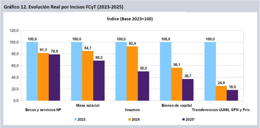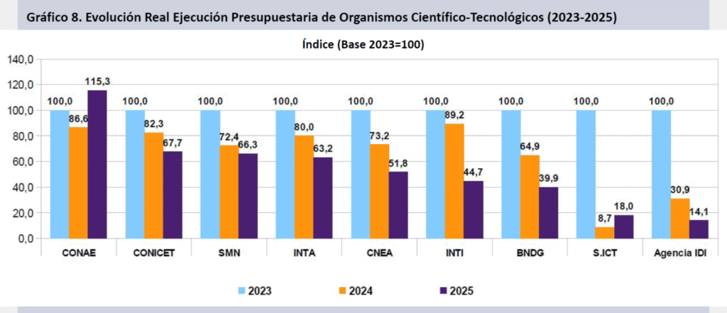 A su vez, en el informe se destaca que en el mes de septiembre casi todos los organismos del Sistema Nacional de Ciencia, Tecnología e Innovación continuaron perdiendo financiamiento. “Mientras la Secretaría de Innovación, Ciencia y Tecnología y la Agencia IDI lideran la caída, se consolida un ajuste en torno al 45% de caída real en dos años para la mayoría de los organismos del sector”, se explica en el documento.