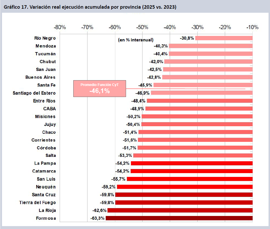 Por último, el informe hace referencia a la distribución federal de los recursos. En este sentido, asegura que estos no se han retraído de manera pareja en todo el territorio, sino que algunas provincias se han visto especialmente perjudicadas. Mientras el promedio de la caída presupuestaria acumulada en septiembre de 2025 en relación al 2023 fue del 46,1%, en 17 provincias estuvo por encima del promedio.