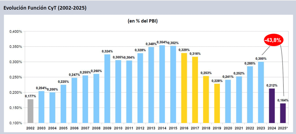 1. El financiamiento público de la ciencia llegó a un mínimo histórico argentino: pasó del 0,30% del PBI en 2023 hasta el 0,164% en 2025. Se trata de una reducción del 43,8% en dos años. De esta manera, hoy se encuentra por debajo incluso del anterior mínimo en el año 2002.