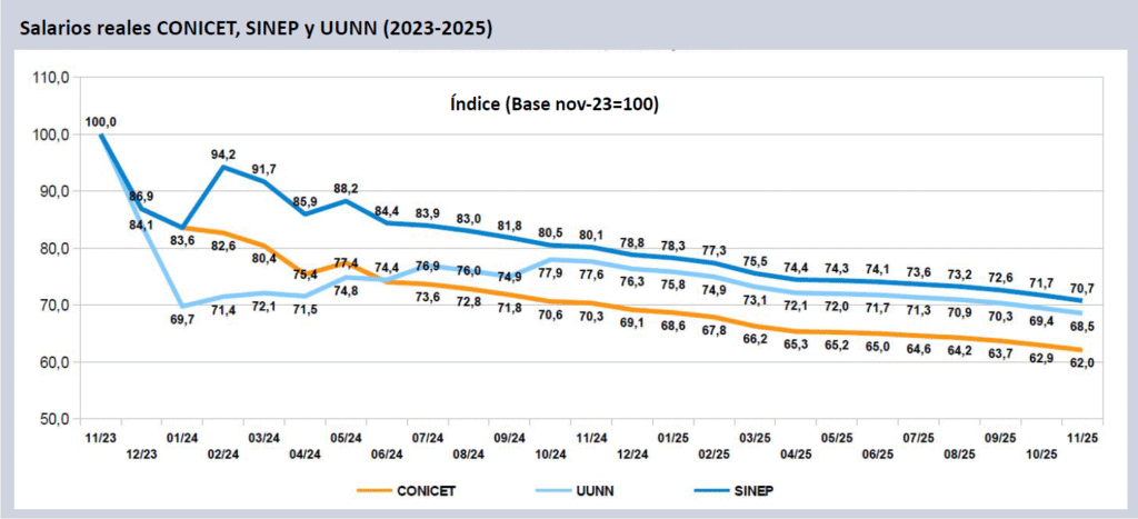 2. Los sueldos del sector científico cayeron hasta un 38%: investigadores, personal técnico y personal de apoyo de CONICET, de organismos dependientes del Sistema Nacional de Empleo Público y de Universidades Nacionales padecieron mes a mes un deterioro programado de sus ingresos.