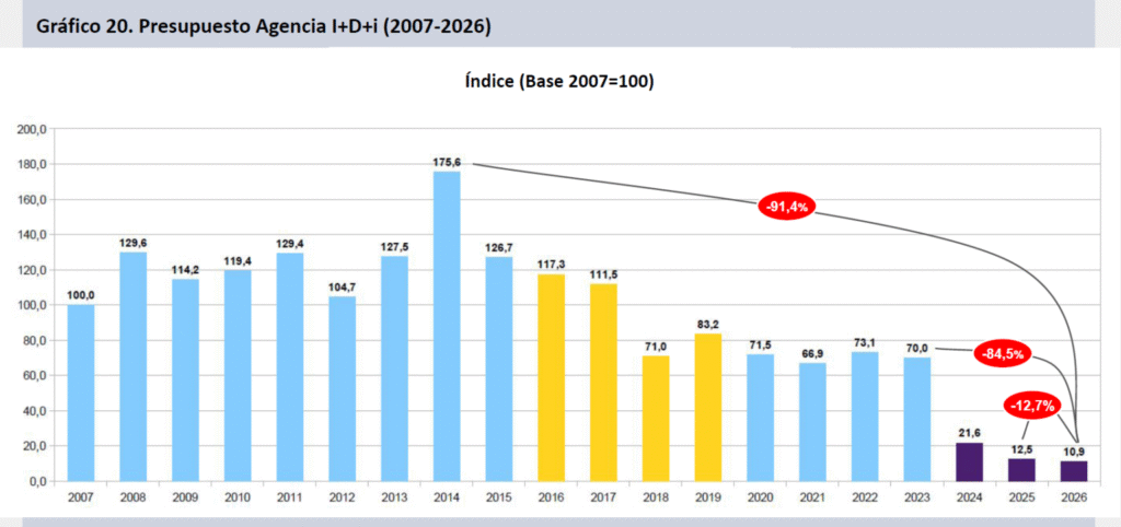 A su vez, en el informe se señala que “una síntesis muy explícita de la política hacia el sector se aprecia al observar la evolución del presupuesto de uno de los organismos transversales del sistema, la Agencia I+D+i, ente clave para el fondeo de la ciencia y tecnología”. Su financiamiento caerá un 12,7% en 2026, tras consolidar caídas del 69,1% en 2024 y del 42,4% en 2025, totalizando un deterioro del 84,5% en tres años.