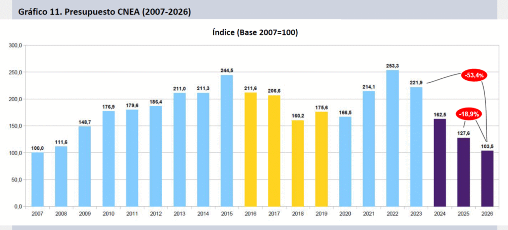 Por último, la Comisión Nacional de Energía Atómica, tercer organismo del SNCTI en volumen presupuestario, nodal del sector nuclear en nuestro país, se perfila a una reducción del 18,9% de su presupuesto en 2026. De continuar este camino, habrá perdido 53,4% de su financiamiento en tres años.