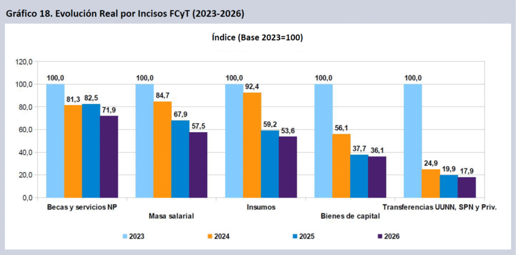 Al estudiar el presupuesto científico por objeto de gasto, el Grupo EPC-CIICTI identificó que la masa salarial caerá 42,5 puntos entre 2023 y 2026. Además, destacó que la inversión en bienes de capital disminuirá 63,9% en el mismo periodo y las transferencias a las Universidades Nacionales, al Sistema Público Nacional y al sector privado lo harán en un 82,1%.