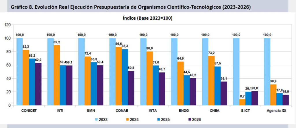 El último informe del Grupo EPC-CIICTI revela que, en el escenario actual, el Sistema Nacional de Ciencia, Tecnología e Innovación (SNCTI) presenta un panorama crítico, en el que los organismos más voluminosos del sector (CONICET, INTA, CNEA, INTI, entre otros) pueden perder entre 37 y 65 puntos reales en tan solo tres años. Incluso, algunos casos extremos, como la Secretaría de ICT y la Agencia IDi, pueden llegar a descender entre 80 y 85 puntos reales desde 2023.